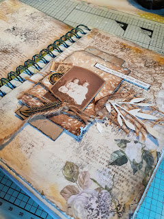 some stamping then layers including lace, doilies, papers, ephemera, my final top piece and title, on the balance page i added the lace again , gorgeous little frame and matching flower.